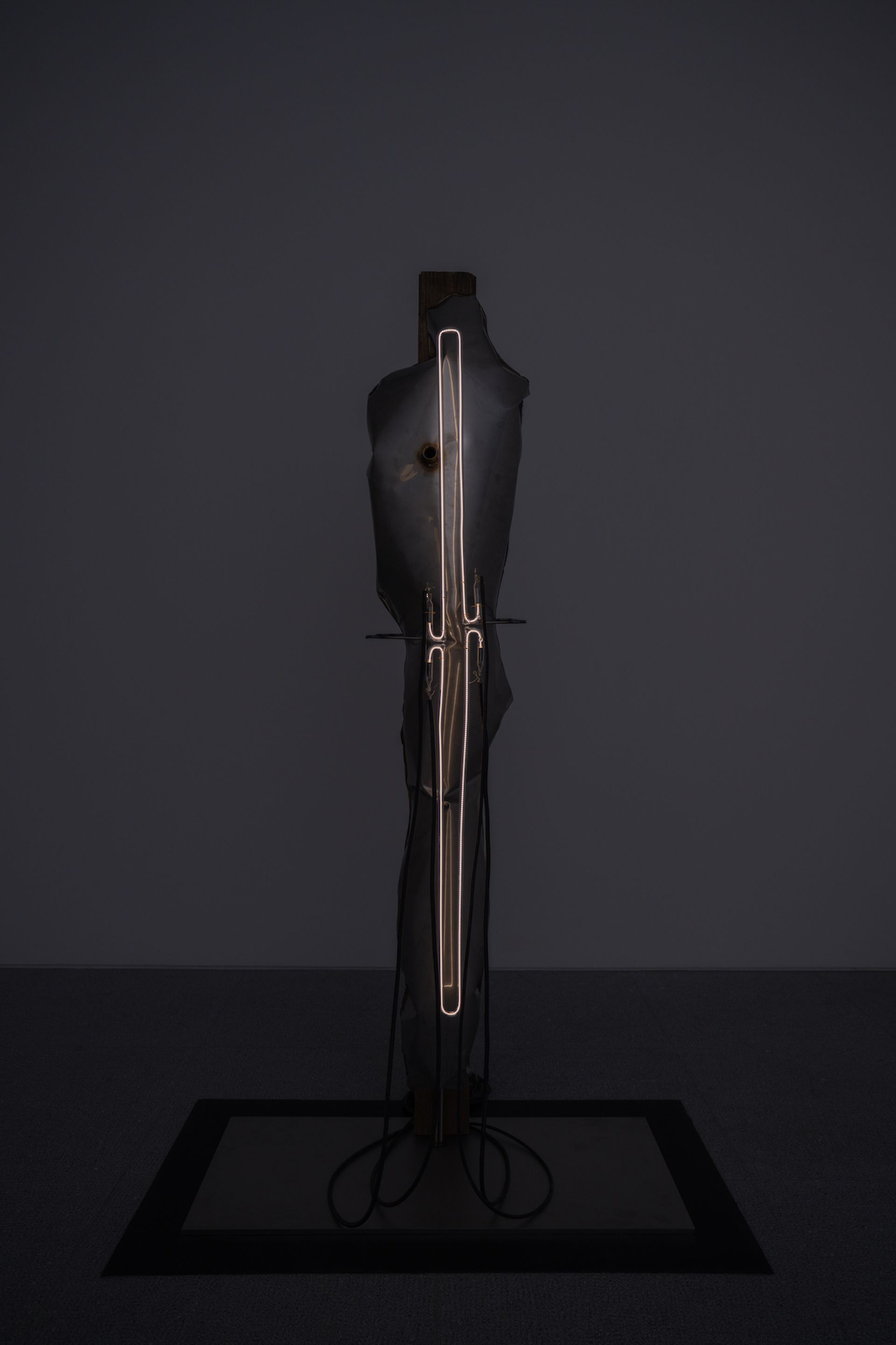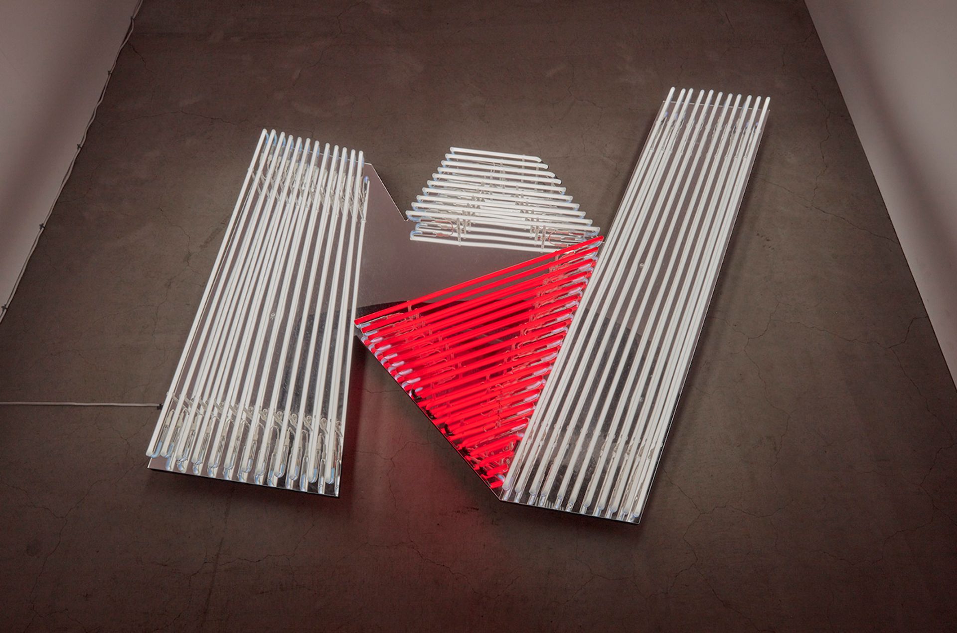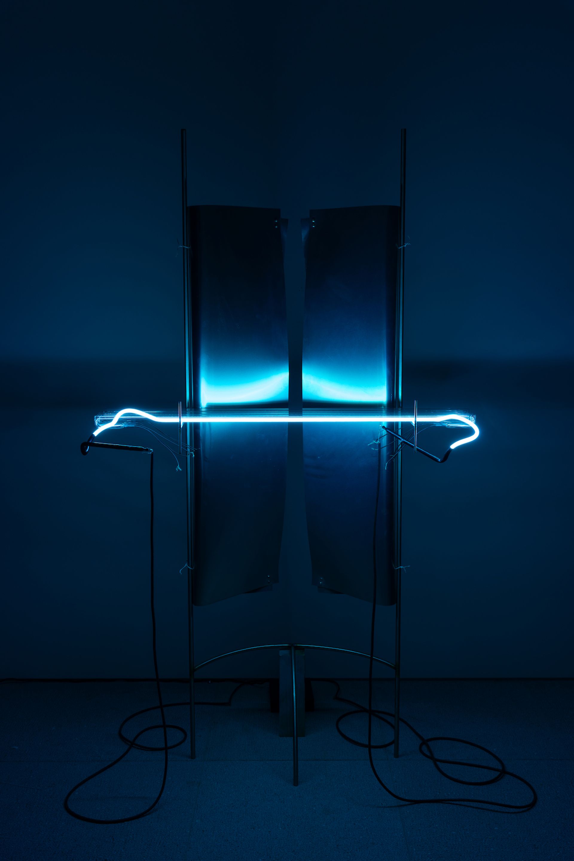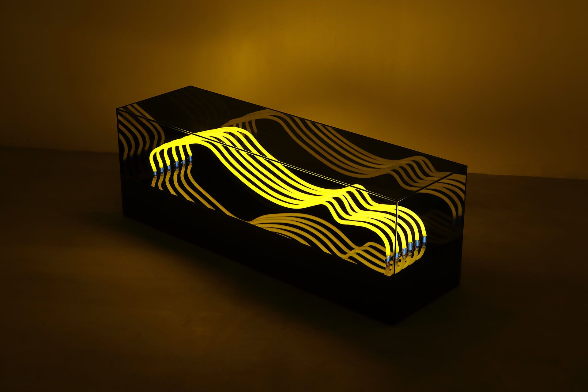 Neon, a medium that is often culturally associated with signage, is treated as a final form in and of itself within Fukui’s works. The son of a Buddhist temple family, Fukui’s childhood exposure to candle-lit prayers and shining golden Buddha statues shaped his ‘formative experience of light,’ and he naturally found himself drawn to the element as a pathway to creating environments. In 2017, he began training as a craftsman at Shimada Neon, one of the leading factories in Japan, before eventually moving to New York where he studied under the tutelage of distinguished neon specialist David Ablon, who also worked on pieces by the late 20th century artist Nam June Paik. A craftsman as well as an artist, Fukui’s intimate relationship with the physical hardware that powers neon (glass, electricity, argon gas, etc.) functions as a starting point for his evolving practice, allowing him to flexibly experiment with ways of “setting neon light free” to create new meaning.