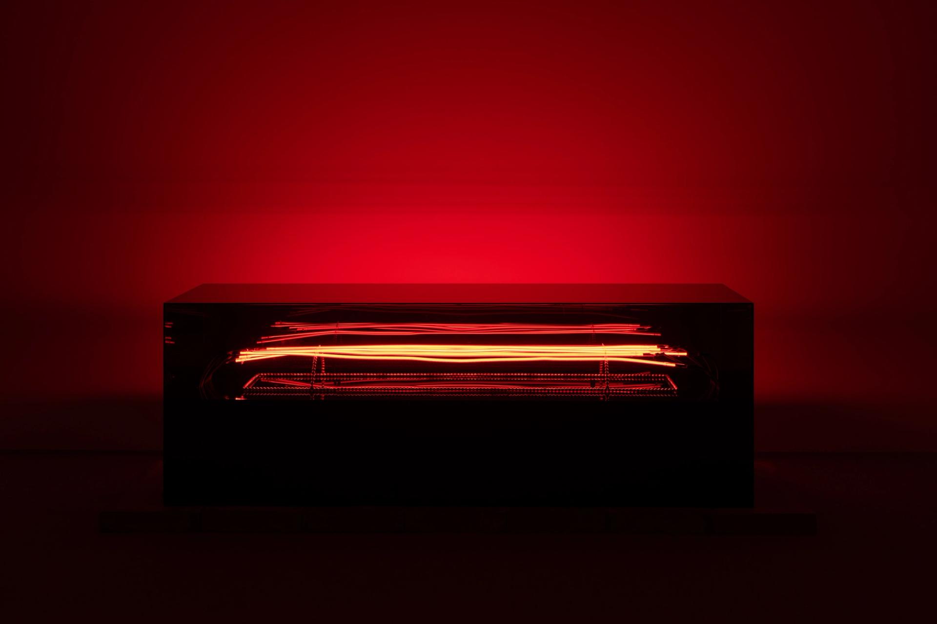 12, 10 and 8 mm glass tubes, neon gas, acrylic box with wood base